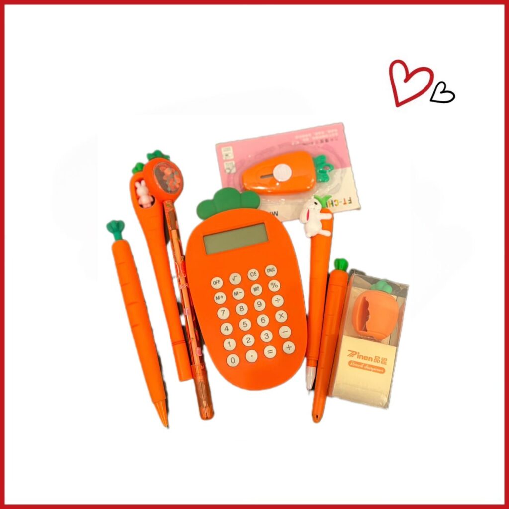 پکیج محصولات هویجی شامل یک عدد ماشینحساب هویجی، کارت هویجی، 3 عدد خودکار هویجی با طرح های مختلف، یک عدد اتود هویجی، یک بسته نوک هویجی، یک عدد تراش هویجی و یک هایلایتر هویجی با رنگ شانسی